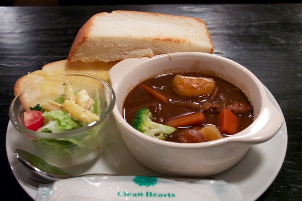 ビーフシチューとパン、サラダ
